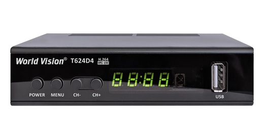 Новинка 2022 года, новая комбинированная телеприставка World Vision T624 D4 в металлическом корпусе базируется на высокопроизводительном процессоре GUOXIN GX6701, поддерживает прием цифрового ТВ в стандартах эфирного DVB-T/T2 и кабельного DVB-C телевидения. Данная модель представляет собой обновлённую модификацию телеприставки T62D4, но уже с новым аппаратным обеспечением, а также графической оболочкой которая по удобству управления не уступает предыдущей, все программные изменения тщательно проработаны и изменены только на повышение стабильности работы нового программного обеспечения. В телеприставке World Vision T624 D4 установлен хорошо зарекомендовавший себя тюнер MaxLinear MXL608, обладает хорошей чувствительностью приёма DVB-T/T2 и DVB-C сигнала, в результате пользователь получает стабильность трансляции и качественное цифровое изображение на экран своего телевизора. Как и во всех новых моделях цифровых телеприставок World Vision, присутствует возможность подключения устройства к беспроводной сети через внешний USB Wi-Fi адаптер, поскольку не все модели адаптеров подходят для реализации такого вида соединения, то подробная информация указана в характеристиках на устройство. При подключении к сети интернет пользователь получит дополнительный программный функционал, это обновление программного обеспечения по сети интернет, информация о прогнозе погоды на неделю в приложении "Погода", плеер IPTV для просмотра интернет трансляций ТВ каналов, онлайн-кинозал Мегого с огромной медиатекой фильмов, сериалов и мультфильмов, RSS новости. Модель World Vision T624 D4 после подключения в USB разъём накопителя памяти, поддерживает всевозможные PVR функции, стандартная немедленная запись телепрограммы, запись по таймеру установленному в ручном режиме или через телегид расписания по программам, отложенный просмотр таймшифт. В программном обеспечении удалось реализовать все функции предыдущего популярного у пользователей модельного ряда Т62, а также модифицировать их, такие, как: синхронизация времени по сети интернет, загрузка в режим ожидания при аварийном отключение электричества, стартовая загрузка телеприставки в режим IPTV плеера, регулировка яркости LED дисплея как в рабочем режиме, так и режиме ожидания.