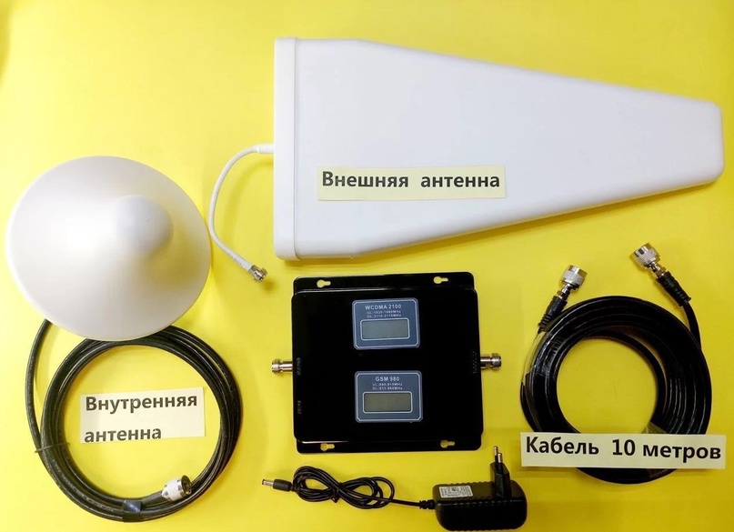 Основной блок усилителя , уличная направленная антенна с кабелем 10 метров, комнатная круговая антенна с кабелем 3 метра, адаптер питания.